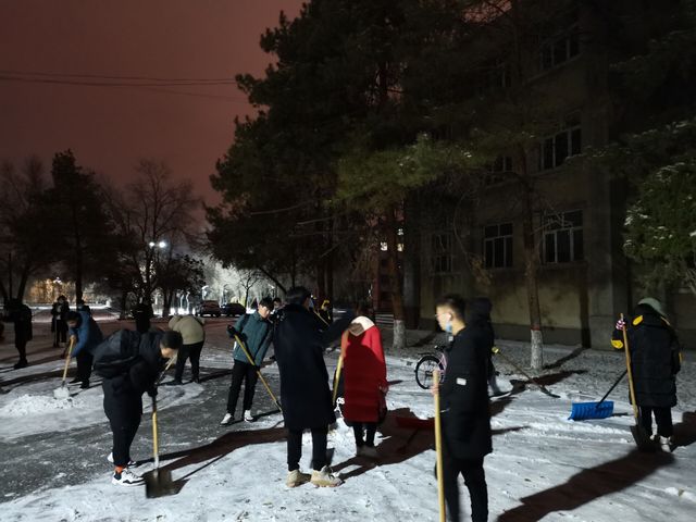 同学们踏着积雪,不畏严寒,准时集合,分工合作。首先,由班长为大家分发劳动工具,大家的积极性都非常高涨,分发完后,每位同学拿着劳动工具到指定区域进行劳动。男生班委带领男生们挑起了扫雪的大梁任务,女生们则做好配合。一部分同学负责使用扫把将积雪扫到一堆,一部分同学负责将积雪扫到马路两旁,不影响出行。同学们工作有条不紊,秩序井然。在同学们共同努力下,校园马路上厚厚的积雪被扫除,保证了同学的安全出行,消除了安全隐患。寂静的黑夜中,劳动工具与地的摩擦声和同学们明朗的笑声却显得格外的灿烂与温暖,他们用自己的实际行动展现出一道亮丽的风景线,展现了我们预防学子的独特风采。