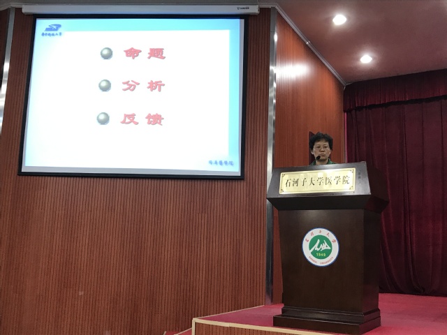 培训课上,厉岩教授从考试测量学的命题、分析、反馈三个方面进行了授课。命题方面,提出了命题双向细目表的指导作用;分析方面,重点探讨了考试信度和效度、试题难度和区分度;反馈方面,强调了考试成绩分析、试卷质量分析、试题质量分析对院系、教研室、教师、学生、专家的反馈体系。并以华中科技大学同济yl23455永利官网为例,对临床主干课程进行考试测量学分析,推动教学改革,提高考试质量,最终促进执业医师考试资格考试合格率上升。