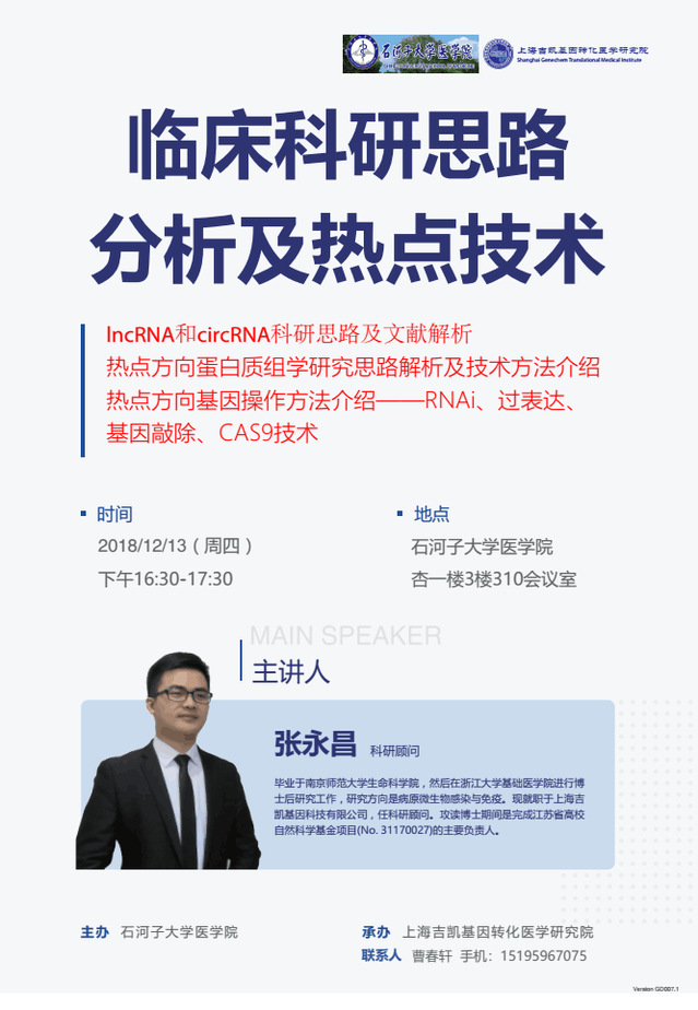 2018年12月13日周四下午16:30,在yl23455永利官网杏一楼3楼310会议室,由上海吉凯基因转化医学研究院的张永昌科研顾问为大家带来了名为《临床科研思路分析及热点技术》的专题讲座,讲座具体内容如下: