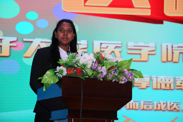 2019届留学生毕业生代表拉金·维玛拉和在校生代表医学检验技术2016级宋淼同学依次发言。