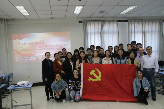 为庆祝中华人民共和国成立70周年,进一步开展好“不忘初心、牢记使命”主题教育,促进民族团结,牢固树立中华民族共同体意识。10月20日,基础医学系教工第一党支部和基础医学系学生第二党支部开展了“党旗映天山,祖国永远在心中”党日活动暨民族团结一家亲联谊活动。