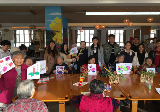 量完血压的老人们前往绘画、折纸区。老人们挑选自己喜爱的图纸和彩笔,进行他们的绘画,每一个绘画小分队的成员也都事先准备了绘图纸,带着画笔一边指导老人们颜色的搭配,同时也和他们一起绘画。此外,折纸小分队成员与老人们用心地折纸,不时有笑声传出。老人们的生活因为我们的到来别有一番乐趣,更显示出了此次活动的意义。