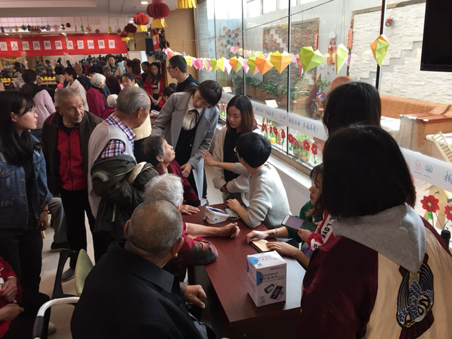 活动伊始,由党支部书记李萍老师讲解了此次活动的目的。教工和学生党员们分成三组志愿服务小分队,分别为测血压队、折纸队和绘画队。在专业教师的带领下,志愿者们为老人们测量血压,并由记录员记录老人的姓名、血压值以及房间号,贴心地为老人们服务。