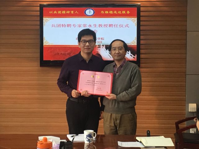 胡昌娃副书记为常永生教授颁发兵团特聘专家聘书。常永生教授表示新疆是个好地方,拥有别的地区没有的独特资源,yl23455永利官网的发展需要团队每一位成员的共同努力。年轻人是带动整个学科发展的中坚力量,培养有潜质的年轻人是关键。同时,学院应该多和内地院校沟通,交流,让更多优秀的人才了解新疆。常永生教授最后表达了对年轻人的殷切希望,希望年轻人发奋图强,坚持不懈的努力,为yl23455永利官网的发展多做贡献!