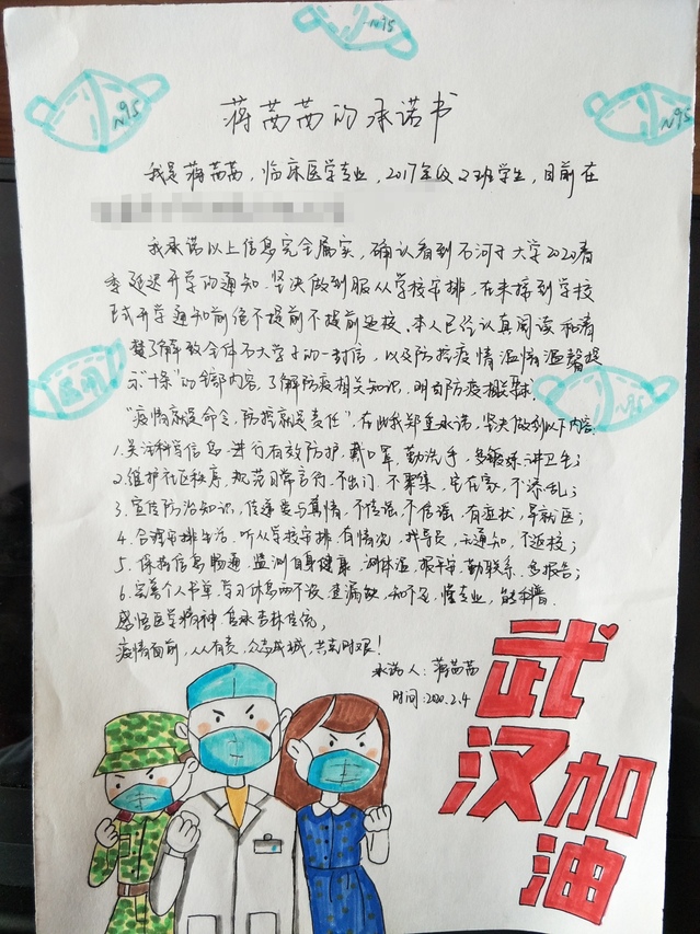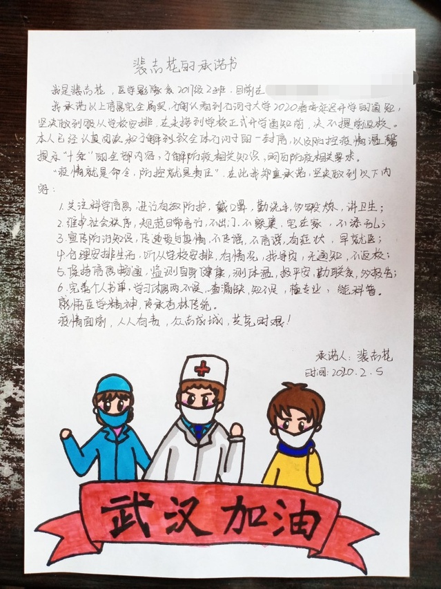 辅导员肖盛中表示:“学生承诺书非常有创意,将承诺书上的文字又通过绘画的方式表达了出来,同时还表达了‘为武汉加油’‘向逆行者致敬’等内容,让人感动。”