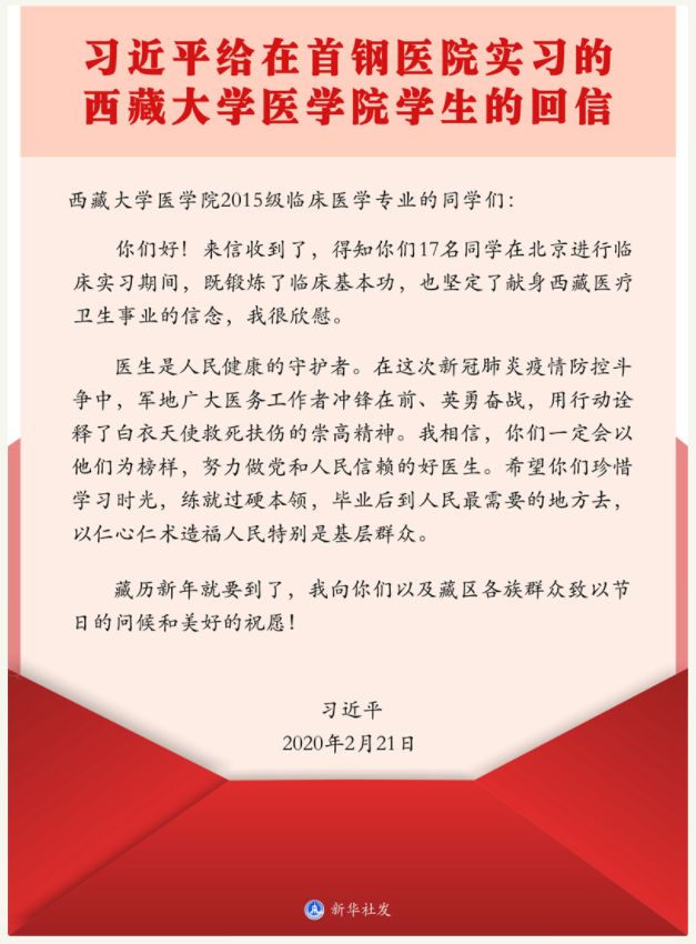 今天看到习近平总书记给西藏大学医学生的回信,我备受感动和鼓舞。习近平总书记在信件中说“医生是人民健康的守护者”,同时勉励医学生“要珍惜学习时光,练就过硬本领,毕业后到人民最需要的地方去,以仁心仁术造福人民特别是基层群众。”如今我身在湖北,每天都能感受到来自学院老师的关心与问候,让我倍感温暖,得知我们的院长和一附院的老师都奔赴前线驰援武汉时,更让我万分感动。毕业后,我也要为祖国的医疗卫生健康事业奉献自己的力量。