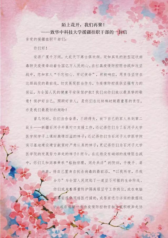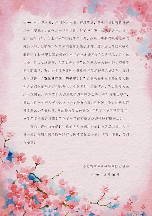 2月26日,yl23455永利官网党委为华中科技大学援疆挂职干部写了一封家书《陌上花开,我们再聚!》,信中对他们援疆期间为yl23455永利官网学科建设建言献策、为yl23455永利官网的发展努力奔走表示衷心的感谢!更对他们在这场没有硝烟的疫情阻击战中,继续秉承“格物穷理,同舟共济”的院训,将自己置身在抗击病毒的最前沿,用实际行动诠释“为天地心,为生民立命,为往圣继绝学,为万世开太平”的医学人志向和传统表示敬意!yl23455永利官网党委通过这一封简短的信,传达着千里之外石大医学人对援疆挂职干部及家属的叮嘱与关心,表达了愿与华中科技大学同济yl23455永利官网的兄弟姐们携手,共抗疫情,“不负恩情不负国”的决心!