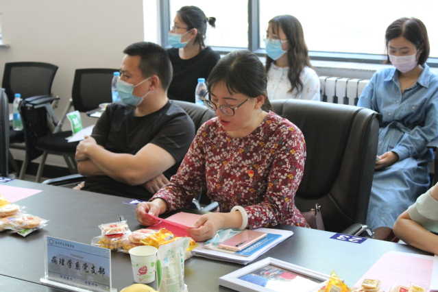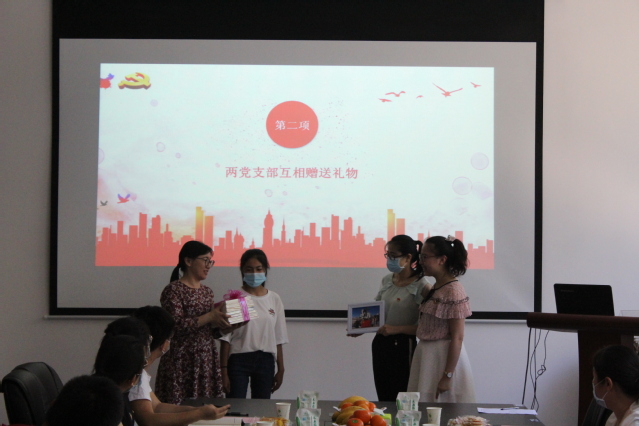 会前,与会人员分别做了简单的自我介绍,两个党支部在支部书记的组织下相互赠送了特别的礼物,教工党支部为学生党支部赠送了红色书籍,学生党支部为教工党支部赠送了支部集体合影。一份小小的礼物承载着支部共建、相互促进、共同成长的美好心愿。