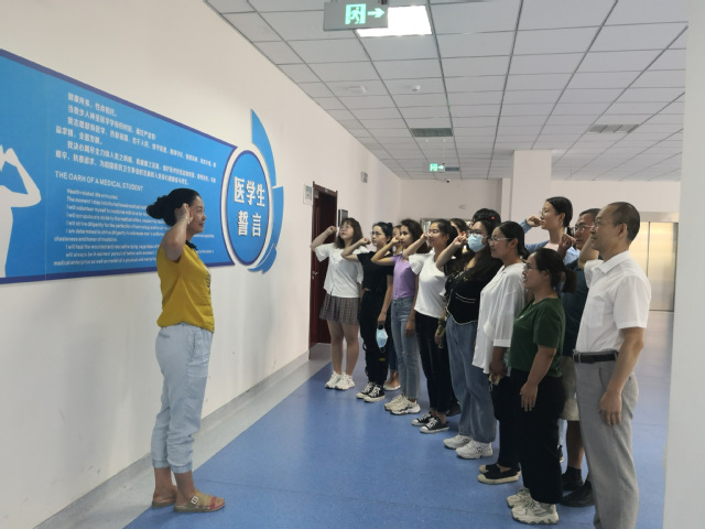 本次典礼活动共分为三个环节。首先,师生们在医学系主任陈雪玲老师的带领下一起重温医学生誓言。“健康所系,性命相托......”在举起右手、重读誓言的时候,无论是即将毕业的、或正在求学的学生,还是毕业已久、工作多年的教师,再一次从内心触动,感受到自己肩上的责任。“忠于人民,恪守医德”无论教学或是科研或是今后的临床工作,都应该不辱使命,站好自己的岗;“我决心竭尽全力除人类之病痛,助健康之完美,维护医术的圣洁和荣誉,救死扶伤,不辞艰辛,执着追求,为祖国医药卫生事业的发展和人类身心健康奋斗终生。”更是让师生始终不忘将用一生从事的医学神圣事业对自己的要求和奋斗的目标。