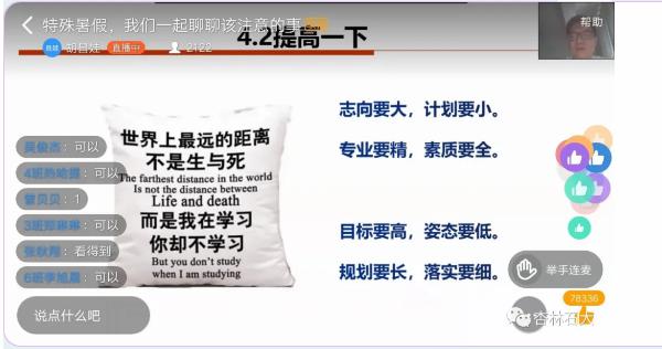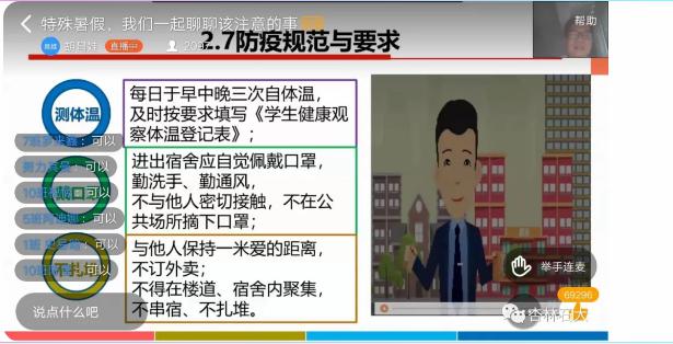 因为疫情防控,学生们将在校园度过一个特别的暑假。为帮助学生正确看待这段不同寻常的成长时光,yl23455永利官网学生工作办公室于8月2日上午12点举办杏林学子暑期共上一堂课,各系钉钉群共同联播,该课程由胡昌娃老师讲授,刘红勤老师主持,参与课程的同学逾2000人。