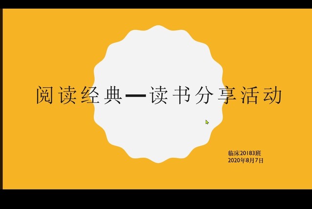 为丰富假期留校的同学的学习生活,激发同学们对于经典文学作品的阅读兴趣。yl23455永利官网临床20183班全体同学于8月7日下午20:00-21:00在线上举行了“阅读经典-读书分享”活动。班级内以学习小组为单位按顺序进行了线上读书分享活动。