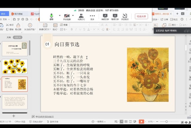 紧接着,杨姣同学为我们介绍了诗人余光中,并为我们分享了余光中先生的《向日葵》、《所谓永恒》、《独白》以及《布谷》等几首诗的节选,她认为在学习与生活中,难免遭受挫折,但心中有信念,有支撑我们的力量,相信我们终会到达理想的彼岸。