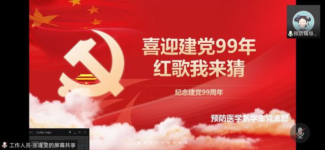 2020年是特殊的一年,是举国齐心协力抗击新冠肺炎疫情的一年,也是中国共产党成立99周年。为增强党性、培养红色基因、丰富同学们在疫情期间的暑假生活,8月8日17:00,预防医学系学生党支部举办主题为“喜迎建党99年,红歌我来猜”的线上红歌比赛。预防医学系党总支书记丁玉松老师、学工部房书帆老师、学生工作部心理咨询中心马冬梅老师,预防医学系闫小龙老师、预防医学系辅导员隋昕老师和预防医学系学生党员、积极分子24人参加了本次活动。