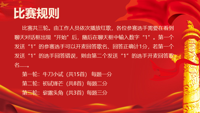 本次比赛共分为三轮。由工作人员依次播放红歌,每首歌播放20秒,参赛选手需要在腾讯会议聊天框中进行抢答,回答歌名。参赛选手们踊跃抢答,在猜出歌名的同时还能唱上几句。经过一个小时的激烈角逐,通过积分的方式,最终评选出一、二、三等奖。