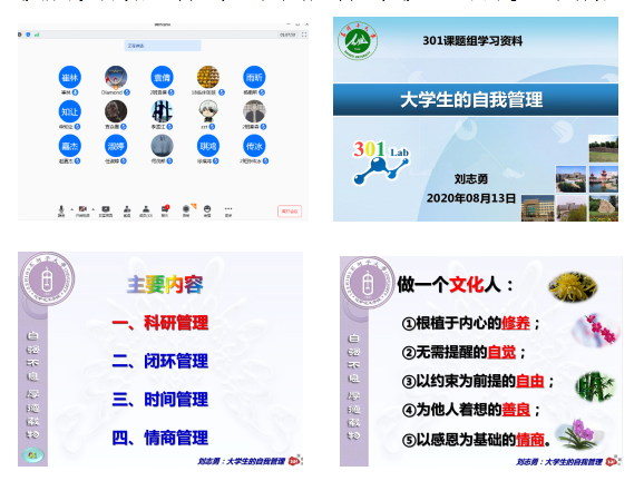 有限的活动区域、没有空调的宿舍、熟悉的舍友…注定了与众不同的2020年暑假。8月13日上午,临床医学2018级2班开展了线上“大学生的自我管理”讲座,石大化学化工学院刘志勇老师,临床医学2018级辅导员雷骥良老师、班主任崔林老师和班级32名同学参加了活动。