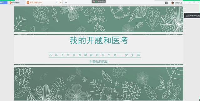 研究生第一党支部以“我的开题和医考”为主题,开展线上主题党日活动,就新学期研究生开题和备考国家执业医师考试,为全体党员和入党积极分子同学们提供在线交流平台。大家针对暑假期间开题准备过程中遇到的困难和问题,互相交流方法和经验。全国执业医师理论考核将近,备考的同学们分享备考心得与应试技巧。