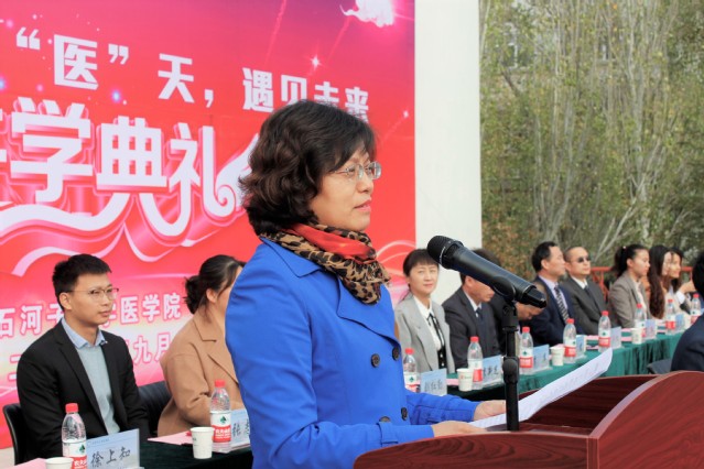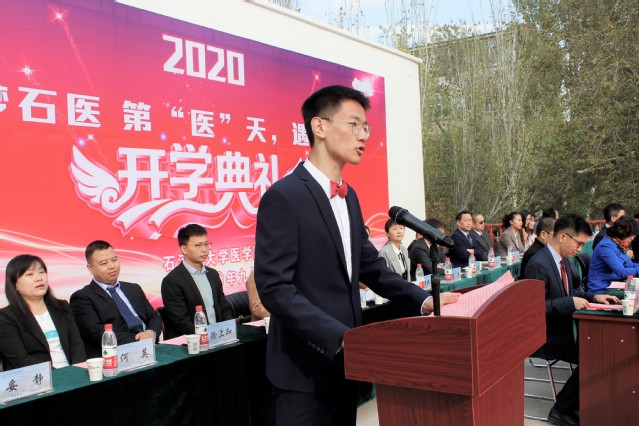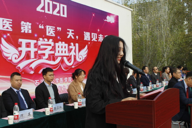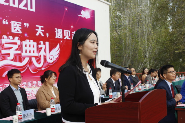临床医学2017级学生阿迪拉作为在校生代表发言。她回顾了自己三年的大学生活,表示石医是一片沃土,希望同学们能够在这里生根发芽,努力书写自己与石医的精彩故事。