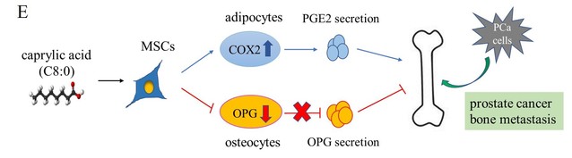 临床资料显示,骨为前列腺癌转移的主要部位,前列腺癌患者有75-80%发生骨转移,但其具体的分子机制目前尚不十分明确。该研究通过体内外实验发现,肥胖后血清中过高的辛酸(C8:0)可通过改变骨髓微环境,暨抑制骨髓间充质干细胞向成骨分化,而促使其向脂肪细胞分化,使骨髓腔中成骨细胞和脂肪细胞比例发生变化,继而为前列腺癌细胞向骨中转移提供了肥沃的“土壤”该研究将为临床治疗前列腺癌骨转移提供药物作用的靶点。