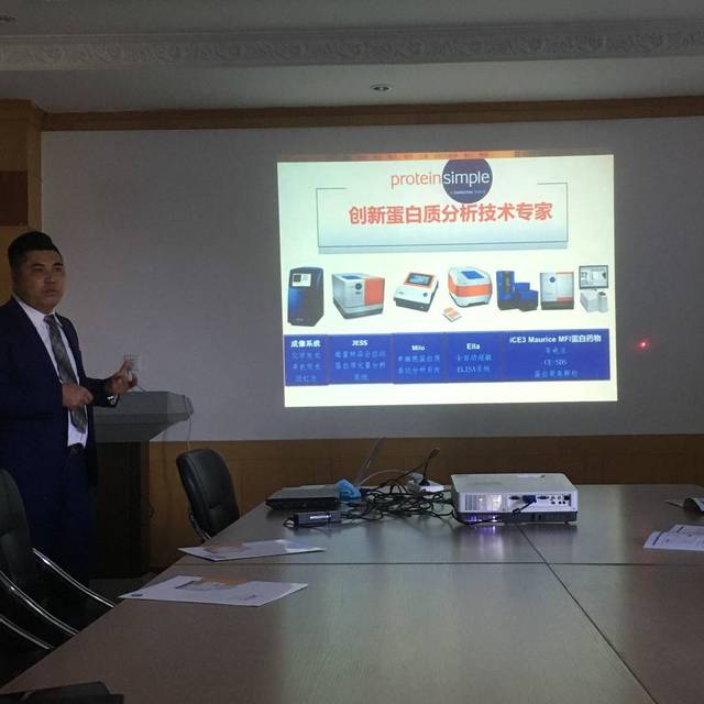 10月23日,ProteinSimple公司技术人员杨生瑞来我院开展创新性SimpleWestern 蛋白质研究新技术讲座,该技术解决了传统Western存在的问题,不用制胶和跑胶,不用转膜,减少实验步骤,避免样品损失,该技术有如下特点:1、检测分子量2-440KD,单个样品上样体积3-5ul,节约珍贵样品和抗体。2、25个样品完成一次实验运行时间3个小时即可获得结果,快速高效。3、自动进行一抗二抗孵育和化学发光检测,自动进行结果分析,有效提高检测结果的精确性和重复性。4、检测灵敏度高,低至pg级,可对结果自动进行精确的定量分析。5、实验完成后自动给出详尽的分析数据,包括目的蛋白大小、信噪比、峰面积和含量。