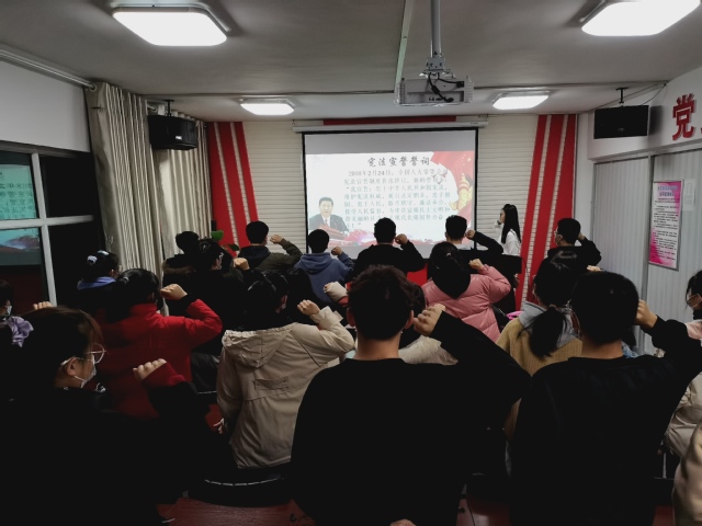 在团支书邵佳慧的带领下,全班同学进行庄严的宪法宣誓。在同学们坚定的誓言声中,本次团日活动接近尾声。辅导员张彦红总结讲到,通过此次团日活动,希望可以提高每一位同学的法律意识和法制观念,成为一个知法、懂法、用法、守法的大学生,并寄予同学在接下来的学习生活中的祝福。