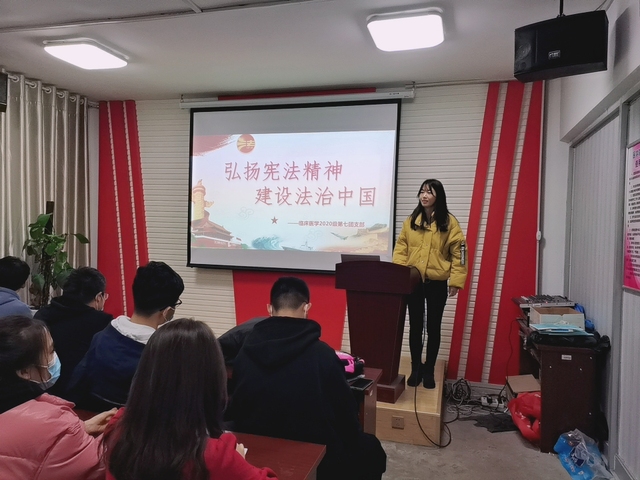 为认真学习贯彻习近平法治思想,深入贯彻落实党的十九大和十九届五中全会精神,推动当代大学生学习宣传宪法,弘扬宪法精神,维护宪法权威,12月4日,临床医学2020级第七团支部在南区12号楼党团活动室举办了“弘扬宪法精神,建设法治中国”主题团日活动。