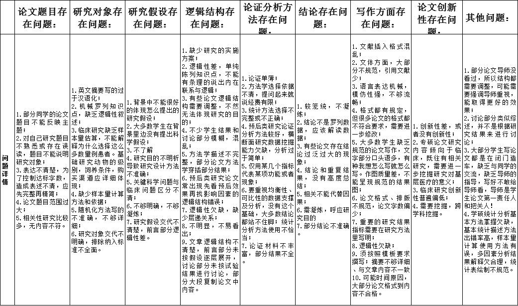 为更加详细的收集本次论文初稿专家意见,所评学科满意度、论文题目、研究对象、研究假设、逻辑结构、论证分析方法、结论、写作方面、论文创新性等方面存在的问题,组织本次审核的老师填写问卷星。统计发现:论文规范性欠佳、论证分析方法不当、核心概念与逻辑混乱、文献综述质量较低、选题意义和严谨性、论文新颖性不高不够等是目前学位论文初稿存在的典型表现。