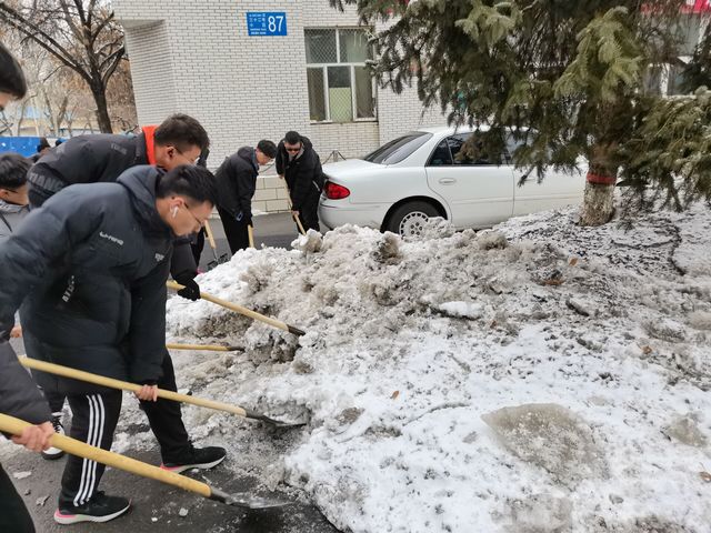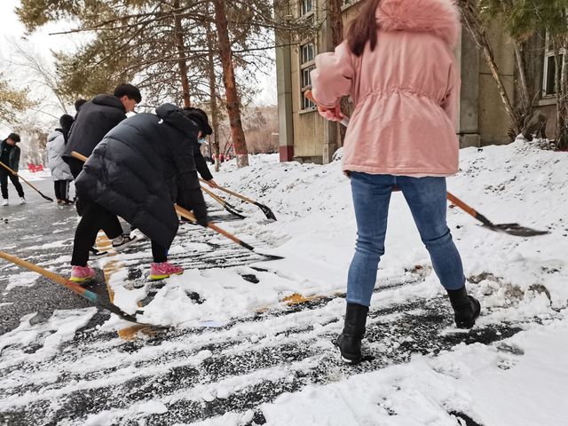雪停之后,辅导员隋昕老师在群里征集扫雪志愿者,却被大伙儿们的热情吓着了。同学们在群里一呼百应,争先恐后地报名参加活动。很快,人手和时间敲定。接着大家又纷纷出动,借工具的借工具,整理着装的整理着装。不久之后,石大校园一隅里便看到了预防学子低头铲雪的身影。