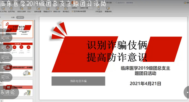 为进一步加强临床医学2019级防范电信诈骗的意识和能力,遏制电信网络诈骗案件的发生,保护学生的财产和人身安全,2021年4月21日,临床医学2019级团总支组织开展线上“识别诈骗伎俩 提高防诈意识”主题团日活动,此次活动由临床医学2019级团总支副书记沈文宣同学主持,全体成员参加本次活动。