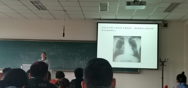 卢老师幽默风趣,声情并茂,同学们聚精会神,认真听讲,积极参与,踊跃提问,宣讲会现场气氛热火朝天。卢老师还给同学们现场展示了尘肺病的正常胸片与病理胸片,并传授了区分二者的方法。