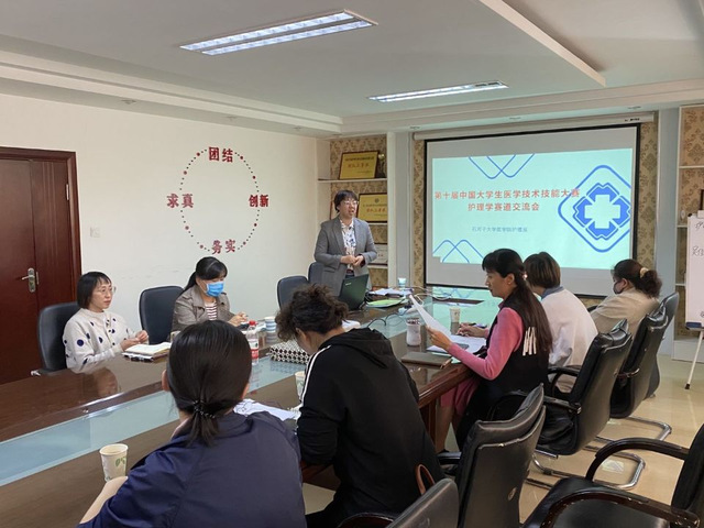 大赛总负责人、护理系副主任姬春老师详细介绍了大赛筹备情况及学生训练情况。其中筹备工作包括成立技能大赛培训小组、选拔学生、制定训练计划。训练过程共三个阶段,包括基础训练:完成考核范围内基本知识和基本技能的培训及考核;赛前准备:完成最终正式参赛队员的确定、比赛前确认、准备工作及组织模拟考核训练;融合训练:指导教师编制模拟病例,利用案例对学生进行训练和考核,巩固技能和理论知识。