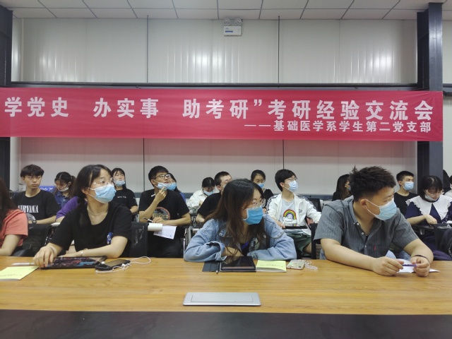 5月9日晚20:30,基础医学系学生第二党支部以线上线下同步进行的方式在杏五学生事务中心举办了“学党史,办实事,助考研”考研经验分享交流会。本次活动邀请了临床医学2016级考研保研成功的优秀师哥师姐魏永存、张秋翔、贺嘉慧、依力米努尔·阿布拉江为大家做分。滕婉蓉老师、雷骥良老师,基础医学系学生第二党支部全体成员及各年级代表26人到场参加,同时吸引了临床大一至大四学生近百人线上聆听。