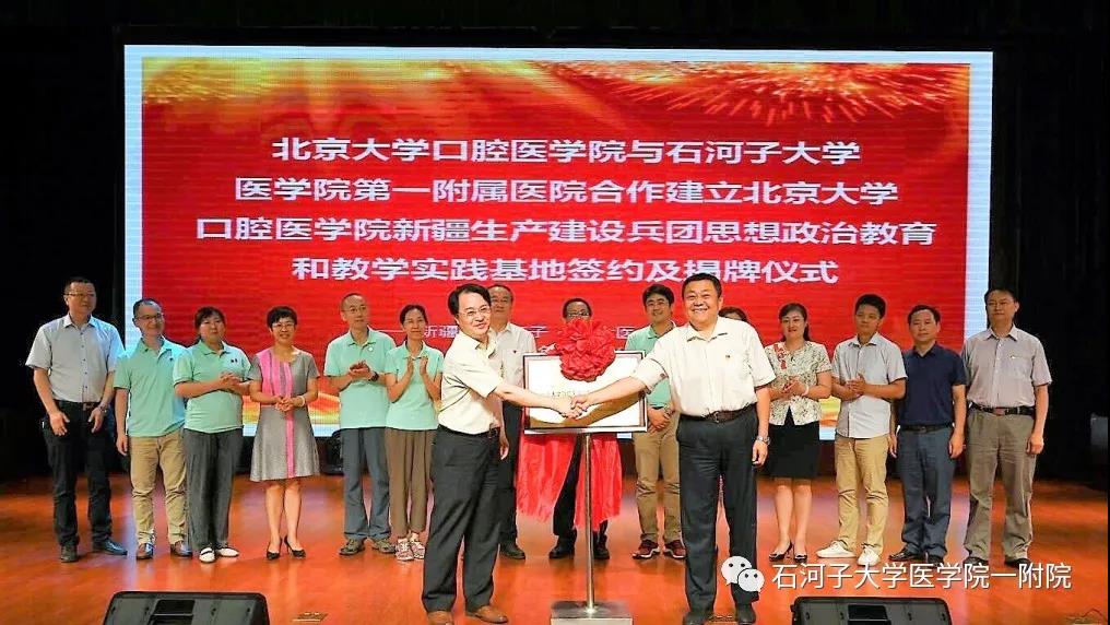2019年8月6日,北京大学口腔yl23455永利官网党委书记周永胜和党委副书记张汉平带队的2019年暑期社会实践团一行18人来我院进行社会实践活动,并举办了北京大学口腔yl23455永利官网新疆生产建设兵团思想政治教育和教学实践基地签约及揭牌仪式。