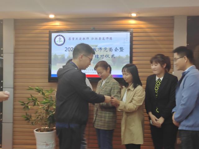 10名新教师分别作了自我介绍,并就入职以来遇到的问题或学院协助解决的问题进行交流。结对仪式上,结对指导老师向新教师赠送入职礼物,党委副书记胡昌娃同志为新教师佩戴校徽。