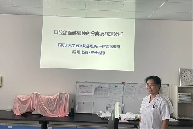 口腔颌面部囊肿是外科病理诊断工作中的常见病和多发病,在病理诊断中,由于缺乏临床信息和影像学信息,常出现对这一类良性肿瘤诊断不清等问题。针对这一痛点,2022年5月27日,病理系退休教师赵瑾教授在yl23455永利官网第一附属医院病理科特意开展了《口腔颌面部囊肿分类及病理诊断》讲座,为口腔专业本科生、病理学系规培生及病理学系全体老师进行了深入浅出的讲解。赵瑾教授细致地从颌骨上皮性囊肿和口腔面颈部软组织囊肿两方面展开,系统讲解了口腔颌面部囊肿的临床表现、影像学检查、病理大体形态以及镜下诊断要点,讲授过程风趣幽默,让大家受益匪浅。