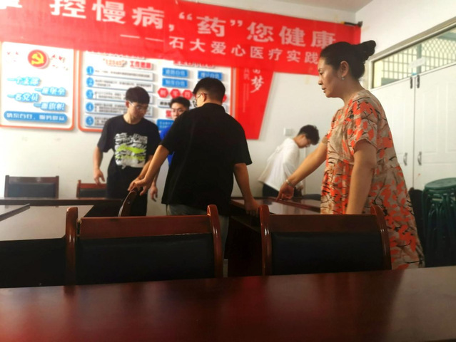 曹爱农书记带领团队来到当地的活动中心参观场地,迎宾路党支部副书记李红霞同志为团队布置场地提供热心帮助。大家团结协作、默契配合,虽然天气炎热,但是大家丝毫不懈怠,宣讲横幅和场地座位布置等迅速准备完毕。伴随着落日余晖,大家都对后续实践活动充满了期待。
