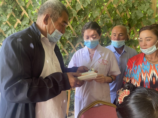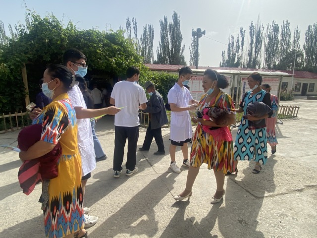 胡杨村位于喀什地区岳普湖县,村民的经济来源主要靠农牧业。由于村民缺少基本的健康常识,村里大部分居民患有脊椎病变、风湿性关节炎、高血压等疾病。“医心助南、守‘肤’健康”爱心医疗社会实践服务团了解这一情况后,联合三师四十二团医院到村里开展免费健康体检活动,为当地居民看病问诊、送医送药,讲解健康知识。