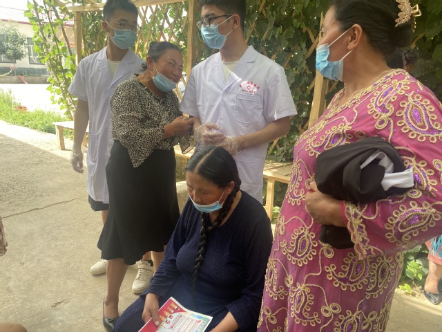 “叔叔,您血压有点高,会有头疼、头晕症状,记得按时吃药”“阿姨,您这是膝关节关节炎,您先坐下,我们可以进行针灸理疗。”,健康体检现场,前来问诊的居民络绎不绝,“医心助南、守‘肤’健康”爱心医疗社会实践服务团成员详细询问每个人病情,做常规检查、登记病例,耐心解答村民疑问,宣传健康知识,指导居民科学用药、合理饮食、注重日常保健。同时,为做好沟通,在少数民族同胞前来问诊时,团队队员马力科·吾马尔江积极担任翻译的重任,搭建起居民与医生之间的桥梁。