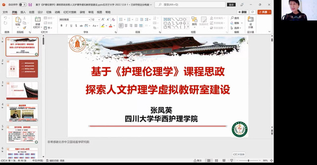 2022年12月8日,护理系邀请四川大学华西护理学院副院长张凤英教授进行题为基于《护理伦理学》课程思政探索人文护理虚拟教研室建设的讲座,护理系全体教师、临床各科室骨干教师和研究生们共76人参加了会议。