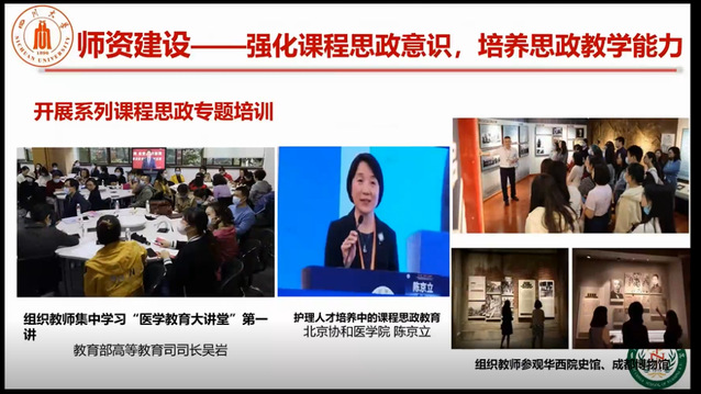立德树人是学生培养的中心环节,课程思政建设顺应时代发展的召唤,在护生培养过程中发挥着愈加重要的作用。如何结合护理学科特色,做好课程思政建设是需要深入考虑的问题。张凤英教授的讲座从华西护理思政体系建设的方案、教师队伍、团队建设、理论与实践等方面,为参会师生打开了认知,为教学设计提供了很好的借鉴。参加培训的老师和同学们都认为通过此次培训收益匪浅,为课程思政和虚拟教研室建设提供了很好的借鉴,今后会结合所学,融入自己的课堂教学中。