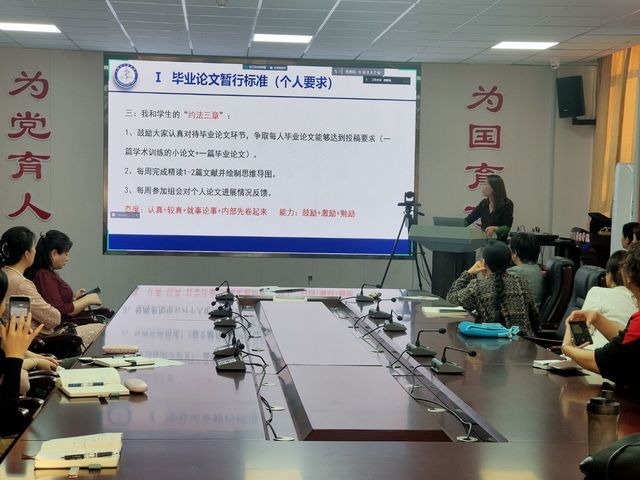 会议第三项,邀请历届校级优秀毕业论文指导老师刘娜、陈洁婷分享了她们的指导经验,她们从选题、资料搜集与整理、提炼观点、拟定提纲、撰写正文、修改定稿等六个方面进行剖析。提出毕业论文工作需注意四个方面:一是论文指导老师要严格遵守毕业论文指导要求,反复斟酌学生的论文选题;二是要严格按照论文撰写计划,及时督促学生完成各阶段任务;三是要谨慎对待定题后学生在研究初期更换题目问题;四是要加强与学生的交流与沟通,指导并帮助学生及时化解论文撰写中存在的难点和疑惑。