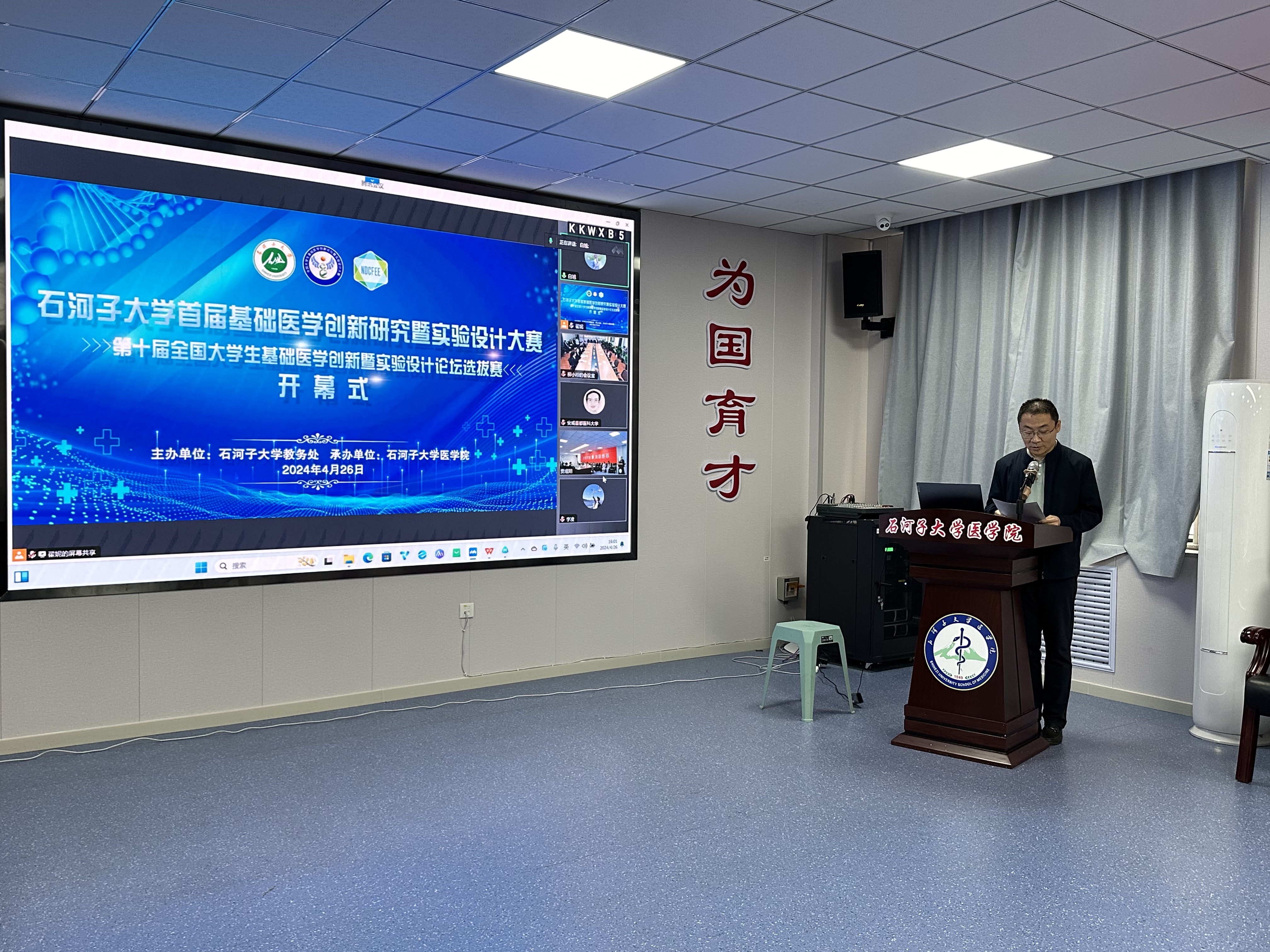 yl23455永利官网院长马克涛教授代表学院对受邀担任此次比赛评委的南方医科大学李凌教授、首都医科大学安威教授、浙江大学周耐明教授、华中科技大学陈辉教授、成都yl23455永利官网姜玉峰教授等5位校外专家和司军强等校内专家表示衷心的感谢。同时他在讲话中指出,此次校赛的举办,是永利官网落实本科教育审核评估、本科专业认证工作要求,坚持“以本为本”、持续推进新时代本科教育“以赛促教、以赛促学、以赛促改、以赛促建”的重要行动;是全面贯彻落实《国务院办公厅关于加快医学教育创新发展的指导意见》(国办发[2020]34号)精神要求,深入推动医学教育综合改革,创新实践教学体系,全面提升医学生的原始创新精神和创新能力的重要举措。希望此次大赛积极发挥牵引带动作用,使更广大师生能聚焦基础医学创新研究、技术攻关,为“健康中国”和“健康兵团”战略贡献石大医学人的力量。