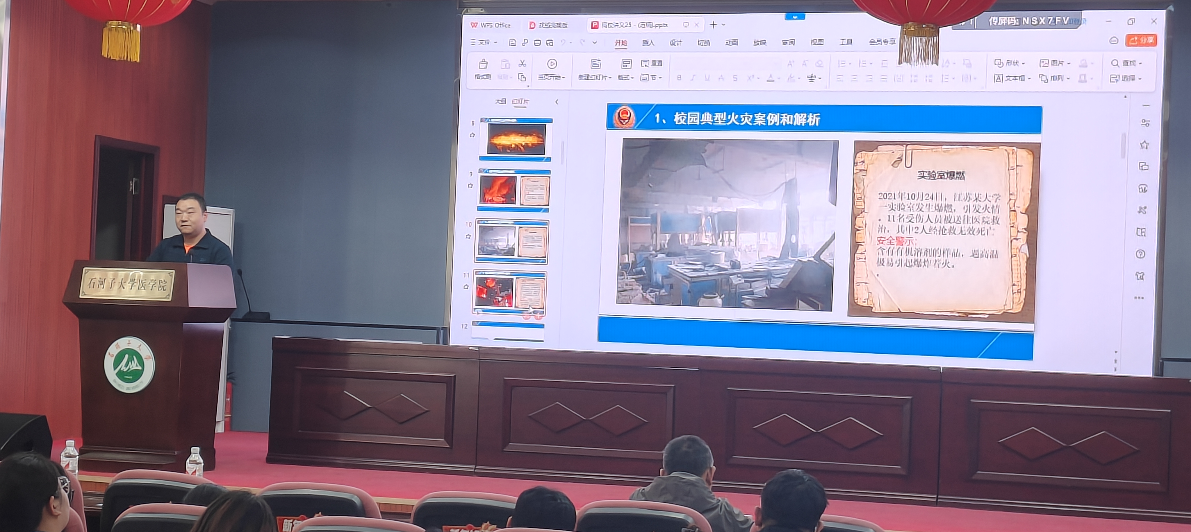 培训会上,来利敏老师在本次讲座中重点讲述了高校近期典型案例,并对地震火灾消防安全疏散逃生为全体参会师生代表进行详细讲解。