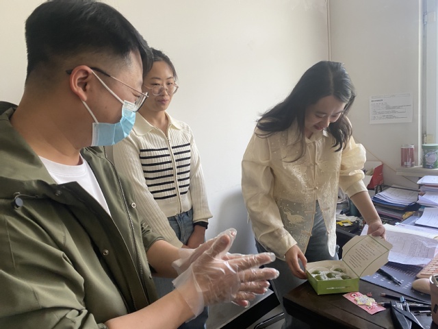 一个小时后各小组制作出了100余枚不同口味的青团,看起来油绿如玉,闻起来清香扑鼻,吃起来糯韧绵软、甜而不腻。为了将美味和快乐分享,护理系李萍书记号召各组青年教师进行“做青团、品春天、送祝福”活动,四位青年教师分别前往党政办公室、教学办公室、研究生办公室、学生办公室赠送刚刚出炉的美味青团,也将春天的祝福送给老师们。