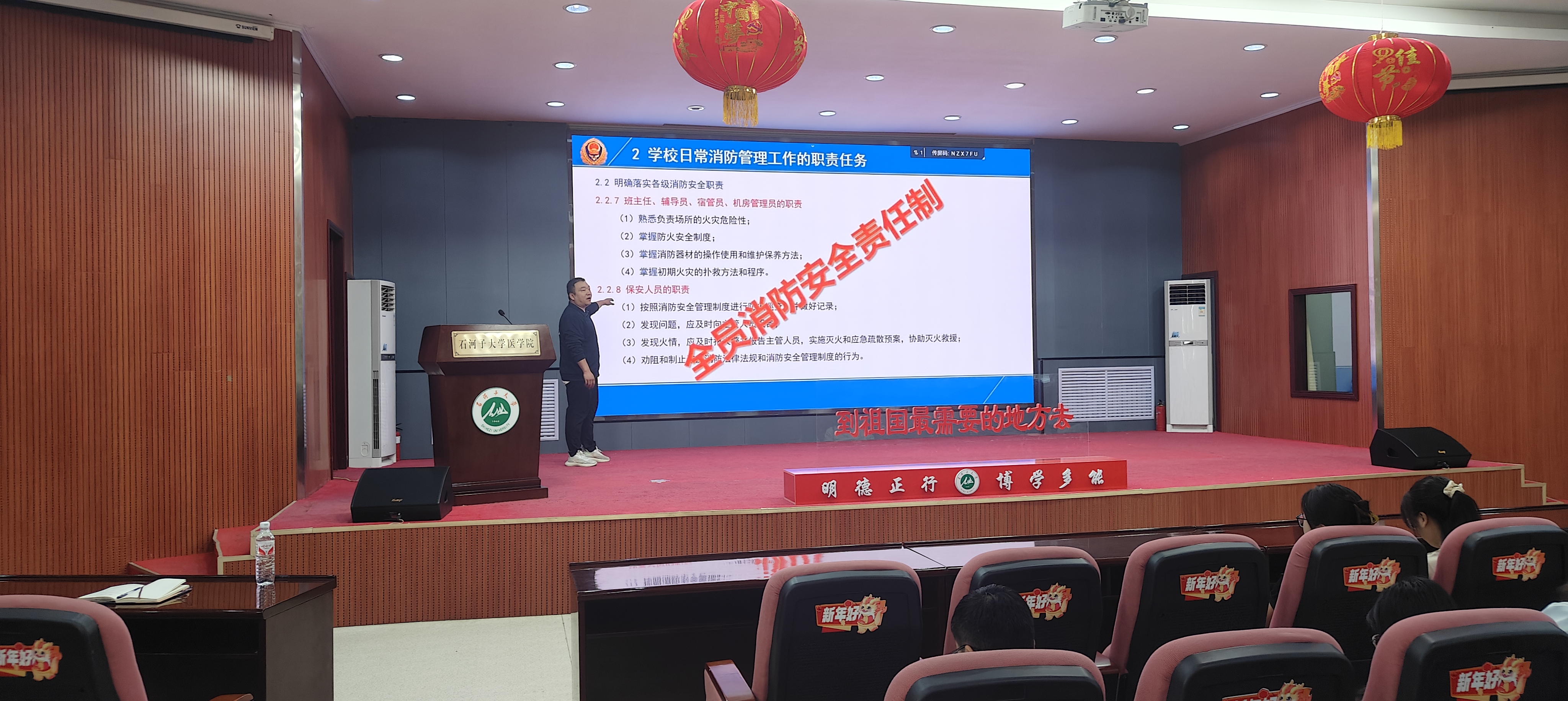 新疆地方与民族高发病重点实验室2024年度 防灾减灾消防安全知识系列培训第二期 为进一步增强研究生消防安全防范意识,宣传消防安全知识,切实提升科研人员的自我保护能力,营造校园良好消防安全环境,yl23455永利官网yl23455永利官网新疆地方与民族高发病重点实验室联合保卫部消防科对实验室各科研团队师生代表开展2024年度防灾减灾消防安全知识系列培训讲座。5月28日下午四点,第二期消防安全培训如期开讲,各科研团队师生代表、重点实验室办公室教师等100余名科研人员参加了培训。
