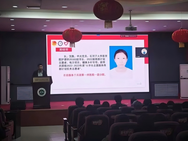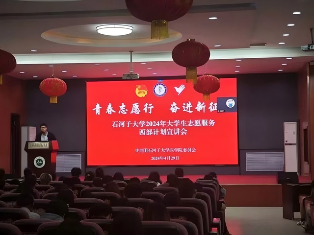 为做好大学生志愿服务西部计划宣传动员工作,号召更多的石医学子积极深入基层,服务西部,并帮助同学们了解相关政策、做好相关准备,4月29日学院团委于南区学术报告厅举办大学生志愿服务“西部计划”宣讲会。此次活动邀请了兵团2022-2023年度“大学生志愿服务西部计划优秀志愿者”黄晓琴进行西部计划工作分享,学院团委书记肖盛中老师进行相关政策讲解,共计200余名学生参加了此次宣讲活动。