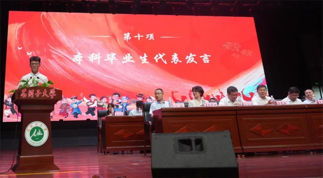大会第十三项 在校学生代表沈晓彤发言。她说:是温暖,是感动,是传承。忘不了,刚入学时,是你们热情周到的安排让我们很快融入到新环境中;忘不了,是你们的宽容和不吝教导,让我们结出了日益成熟的果实;忘不了,是你们挺身而出,遮风挡雨,让我们感受到家人般的关怀。祝贺2024届毕业生如期完成学业,带着学术的智慧,生活的理想,踏上新的征程,开启人生新的篇章!